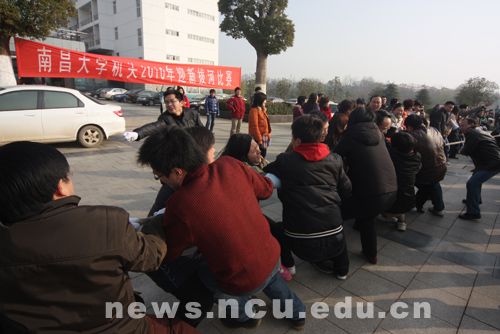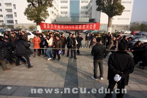 为进一步贯彻落实科学发展观,丰富机关职工的文娱生活,强健体魄,展现机关员工良好的精神风貌。30日下午230分,南昌大学机关2010年迎新拔河比赛在办公楼前举行。机关各部门同志参加了比赛。